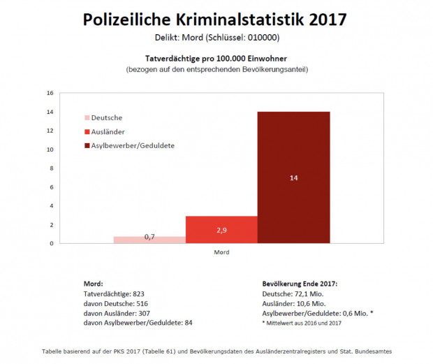 Knapp 40% aller Morde, deren Opferzahl auch 2017 anstieg, wurden von Ausländern verübt, mit 16% mehr tatverdächtigen Asylbewerbern als 2016. Letztere waren im Jahr 2017 20 Mal (oder 1.900%) krimineller beim Delikt „Mord“ als Deutsche: