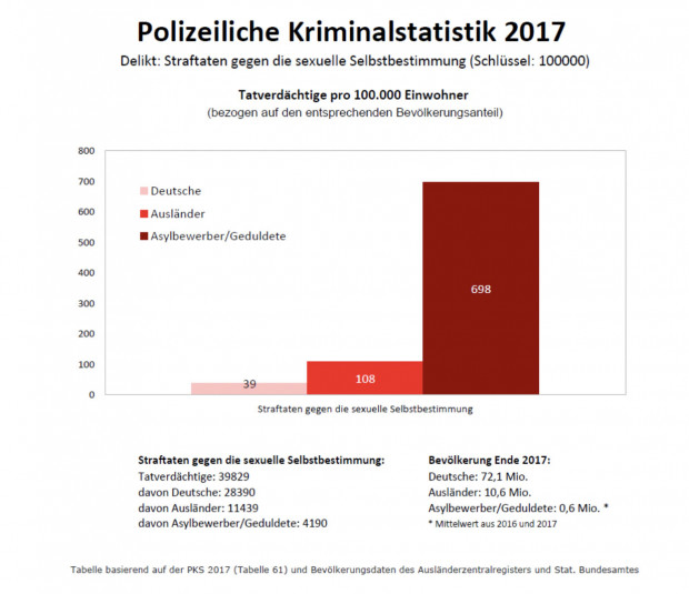 Bei Straftaten gegen die sexuelle Selbstbestimmung wurden 30% mehr Asylbwewerber als Tatbeteiligte ermittelt als 2016, sie waren rund 18 Mal (oder 1.700%) krimineller als Deutsche.
