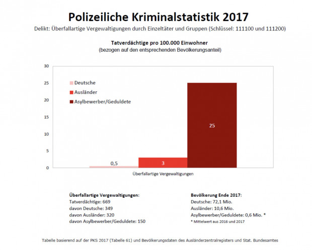Der Anteil ausländischer Tatverdächtiger an überfallartigen Vergewaltigungen durch Einzeltäter stieg 2017 von 34% auf 45%. Knapp 70% aller ermittelten überfallartigen Gruppenvergewaltigungen fallen in die Gruppe ausländischer Täter.
