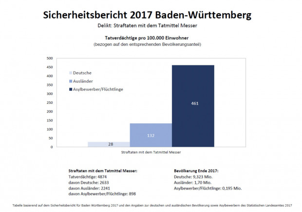 Aus dem Sicherheitsbericht des Landes Baden-Württemberg für das Jahr 2017 geht hervor, dass Asylbewerber/“Flüchtlinge“ im letzten Jahr mehr als 16-mal (oder 1500%) krimineller als Deutsche (*) waren bei Straftaten mit Messern: