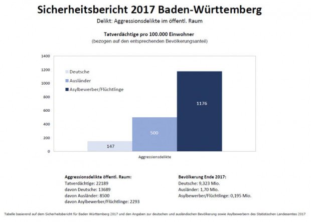 Die Gruppe Asylbewerber zeigte sich hierbei acht Mal (oder 700%) krimineller als Deutsche bei Aggressionsdelikten im öffentlichen Raum: