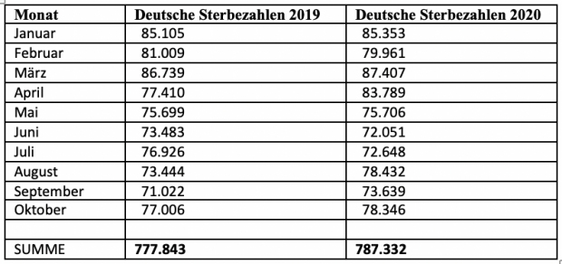 Die Zunahme um 9.849 Fälle markiert ein 1,2-Prozent-Wachstum von 2019 auf 2020. Das ist kein Nullum. Abzuziehen wären von der Zahl allerdings die seinerzeit von Stephan Kohn in die Debatte gebrachten Kollateraltoten durch Nichtbehandlung von lebensgefährlich Erkrankten während des Lockdowns im April. Er wurde dafür diszipliniert. Der Autor hat Kohns Sorgen damals öffentlich geteilt, ist allerdings mit einer medialen Ächtung davongekommen.