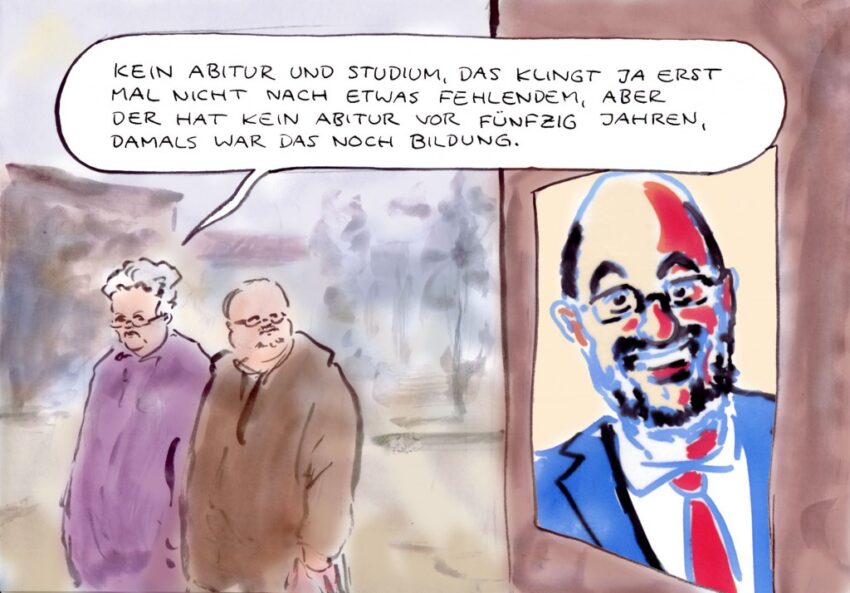 GRÜBELMONSTER sieht es wie viele: Mit einem Bundeskanzler Schulz würde sich an der begonnenen Erosion der Bundesrepublik nichts, aber auch gar nichts ändern. Da kann er sich tausendmal hinstellen und „Ich verlange Gerechtigkeit für alle!“ reklamieren. Sobald es irgendwo ins Konkrete gehen soll, verlässt ihn der schöpferische Funke.