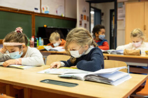 Kinder mit Masken Attest hinten an die Wand im Plexiglaskasten 3m Abstand zur letzten Reihe. Sportunterricht mit Maske im Hulahupreifen. Diktat von Lehrerin der 3. Klasse mit FFP2 Maske gehalten. Ergebnis: die meisten Kinder haben eine 5 oder 6 geschrieben.