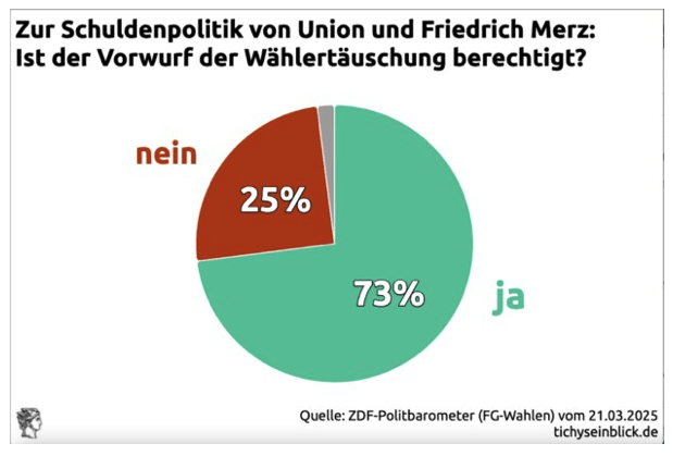 73 Prozent der Befragten einer Umfrage der Forschungsgruppe Wahlen fühlen sich von Merz und der CDU getäuscht. Nur ein Viertel fühlt sich nicht getäuscht. Die Umfrage wurde vom ZDF-Politbarometer veröffentlicht. Interessant wäre zu erfahren, wie viele von den 25 Prozent wussten, was die CDU und Merz vor der Wahl versprochen hatten. Aber wie so oft bei Umfragen bleiben die interessanten Fragen ungestellt.
