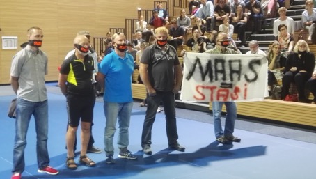 Die Ossis haben 40 Jahre unter Meinungsdiktatur gelitten und ihre Kreativität dagegen aufzubegehren haben sie immer wieder bewiesen, ob in Kabaretts oder Karnevalssitzungen, haben sie mit sprachlich-intelligentem Witz diese Diktatur und Planwirtschaft angeprangert. Seit 2015 machen sie mit Spaziergängen Protest und auch diese Bänder auf denen Stasi 2.0 steht und die ihre Münder verschliessen , würde normalerweise jeden mitfühlenden, freiheitlich denkenden Politiker nachdenklich machen.