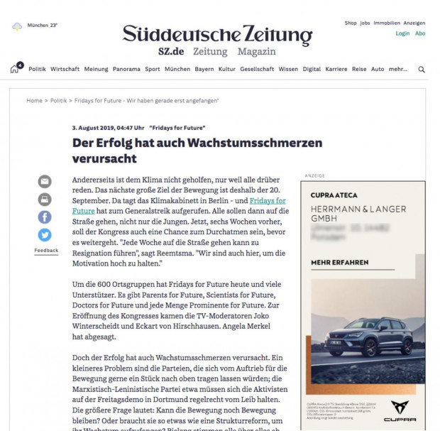 Der innere Zusammenhang zwischen Klimaberichterstattung und Lebensstil bleibt offenbar auch Anzeigenabteilungen und Algorithmen nicht vorborgen. Dafür spricht die Anzeige, die gleich neben der Berichterstattung über die Schüler-Klima-Bewegung erscheint (und zwar als nichtpersonalisierte Anzeige, sie wird auch Lesern angezeigt, die weder Auto fahren noch nach einem Offroadpanzer gegoogelt haben).