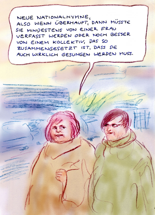 Wieso Nationalhymne? Müsste das nicht Offene-Gesellschafts-Hymne heißen? Vielleicht tut’s auch ein gemeinsamen Klatschen. Denn Sprache grenzt ja aus.
