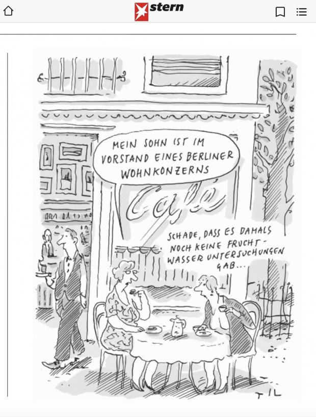 Im aktuellen STERN auf Seite 22, der Seite mit der Überschrift „Humor“, sieht man zwei Damen in einem Café. Die eine sagt stolz zur anderen: „Mein Sohn ist im Vorstand eines Berliner Wohnkonzerns.“ Erwidert die andere: „Schade, dass es damals noch keine Fruchtwasseruntersuchungen gab.“
