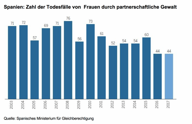 Niemand hatte vorher mit so einer Reaktion gerechnet. Frauen aller Berufe und politischen Überzeugungen streikten an diesem Tag und demonstrierten abends in Barcelona, Valencia und Madrid für mehr Gleichberechtigung, vor allem bei den Gehältern. Damit wurde thematisiert, was so lange hingenommen oder verschwiegen wurde. „Sexuelle Belästigung am Arbeitsplatz ist ein Tabu in Spanien“, glaubt Reimóndez Meilán. Gewalt gegen Frauen in Partnerschaften wird dagegen fast schon überthematisiert in den spanischen Medien, wobei die Rollen ganz klar verteilt sind: der Mann ist der Böse, die Frau die Schwache. In Wirklichkeit rangiert Spanien jedoch in der europäischen partnerschaftlichen Gewalt-Statistik im Mittelfeld. Die Zahl der Toten ist in 2017 von 60 in 2015 auf 44 geschrumpft. Die nordeuropäischen Länder, die bei Gleichberechtigung viel mehr erreicht haben als Spanien, weisen widersprüchlicher Weise mehr Todesfälle auf.