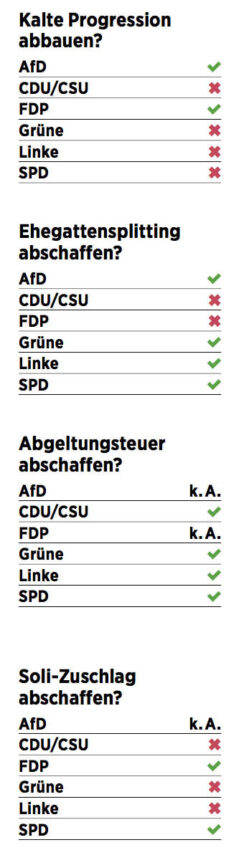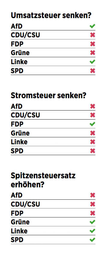 Während FDP und AfD keine speziellen Aussagen zum Spitzensteuersatz machen, wollen Linke und Grüne den Spitzensteuersatz erhöhen. Die Grünen befürworten eine Erhöhung für Einkommen ab 100.000 Euro, sagen aber nicht, wie hoch der Steuersatz sein soll. Offenbar fürchtet man Frust bei den eigenen Wählern aus dem gehobenen Bürgertum.