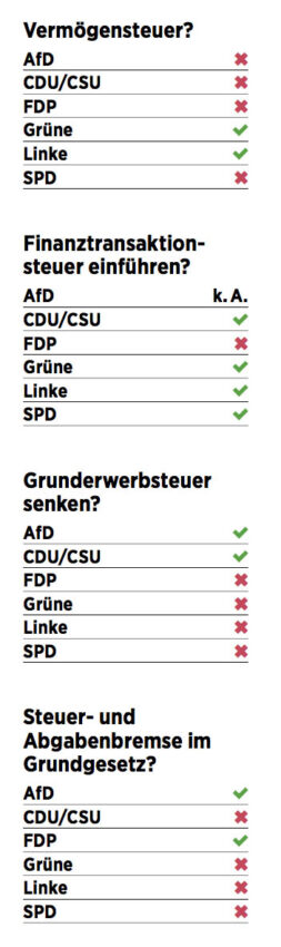 Selbstredend sind Linke und Grüne für die Einführung oder Reaktivierung der Vermögensteuer, doch schon die SPD hat die Forderung nach einer Vermögensteuer nicht im Programm und ist sich da einig mit AfD, CDU/CSU und FDP.