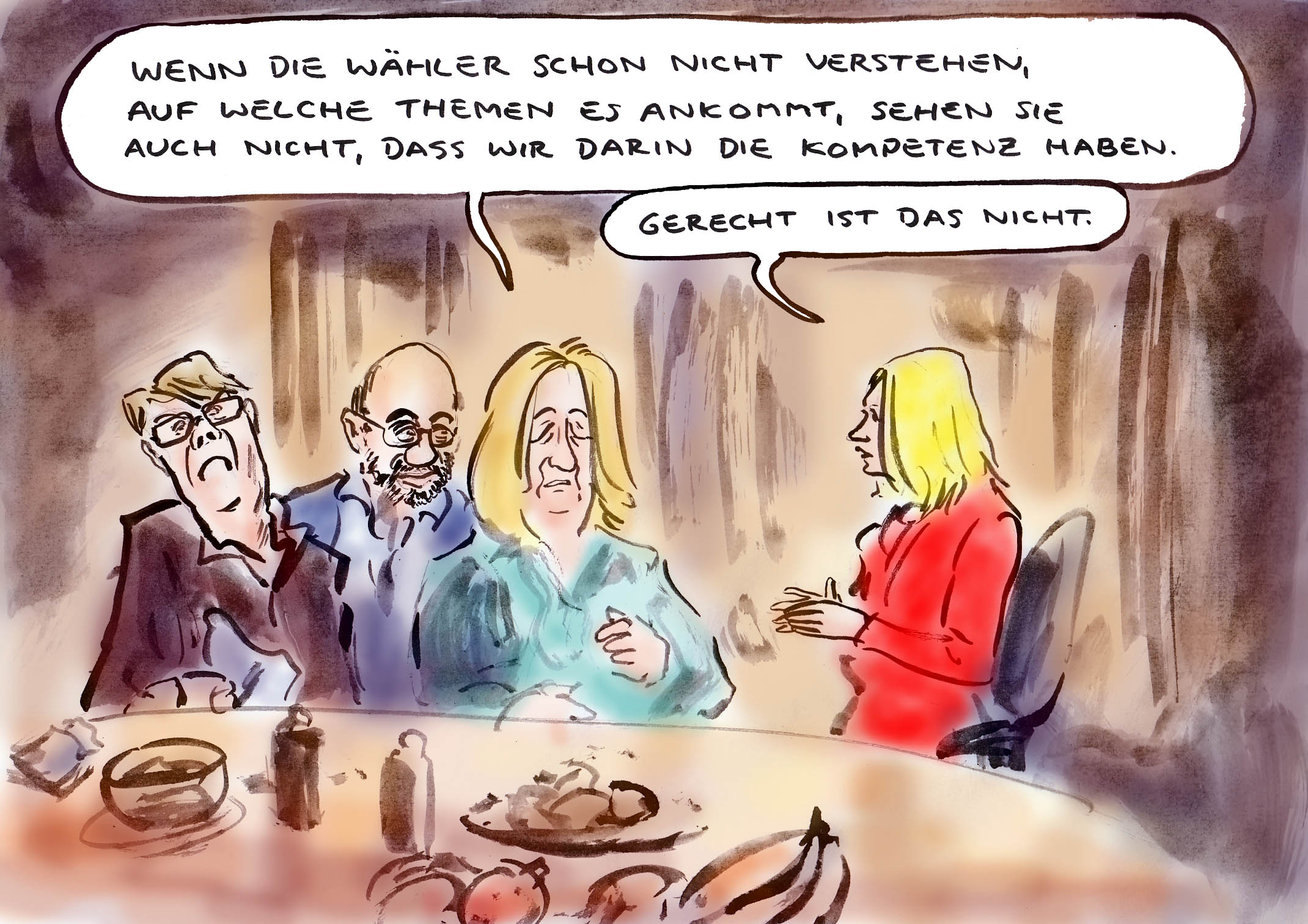 Nicht ganz so pathetisch die Sozialdemokraten. Während Hannelore Kraft immerhin die Zeichen der Zeit schnell erkannte und ihren Rücktritt von allen Parteiämtern erklärte, trösteten sich Bundes-Generalsekretärin Katarina Barley und Manuela Schwesig als „Bundesminister für Gedöns“, wie einst SPD-Kanzler Gerd Schröder das Familien-und-mehr-Ministerium nannte, mit der Erkenntnis, die CDU habe einen „Wutbürgerwahlkampf“ geführt.