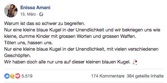 Zwar hatte die Komikerin auf Twitter auch schon mal dringend zur Herstellung des Weltfriedens aufgerufen („Nur eine kleine blaue Kugel in der Unendlichkeit und wir bekriegen uns wie kleine, dumme Kinder mit grossen Worten und grossen Waffen“).