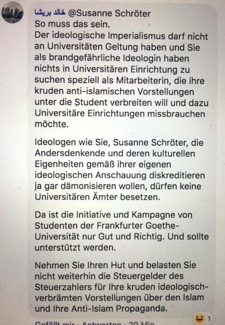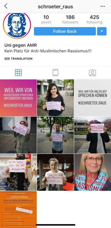 Die Gruppe wirft Schröter den oben schon erwähnten „AMR“ vor, nämlich „Antimuslimischen Rassismus“, ein Idiotenbegriff, nach dessen Logik der Islam, also eine auf mehreren Kontinenten verbreitete Religion, erst einmal rassifiziert werden muss.