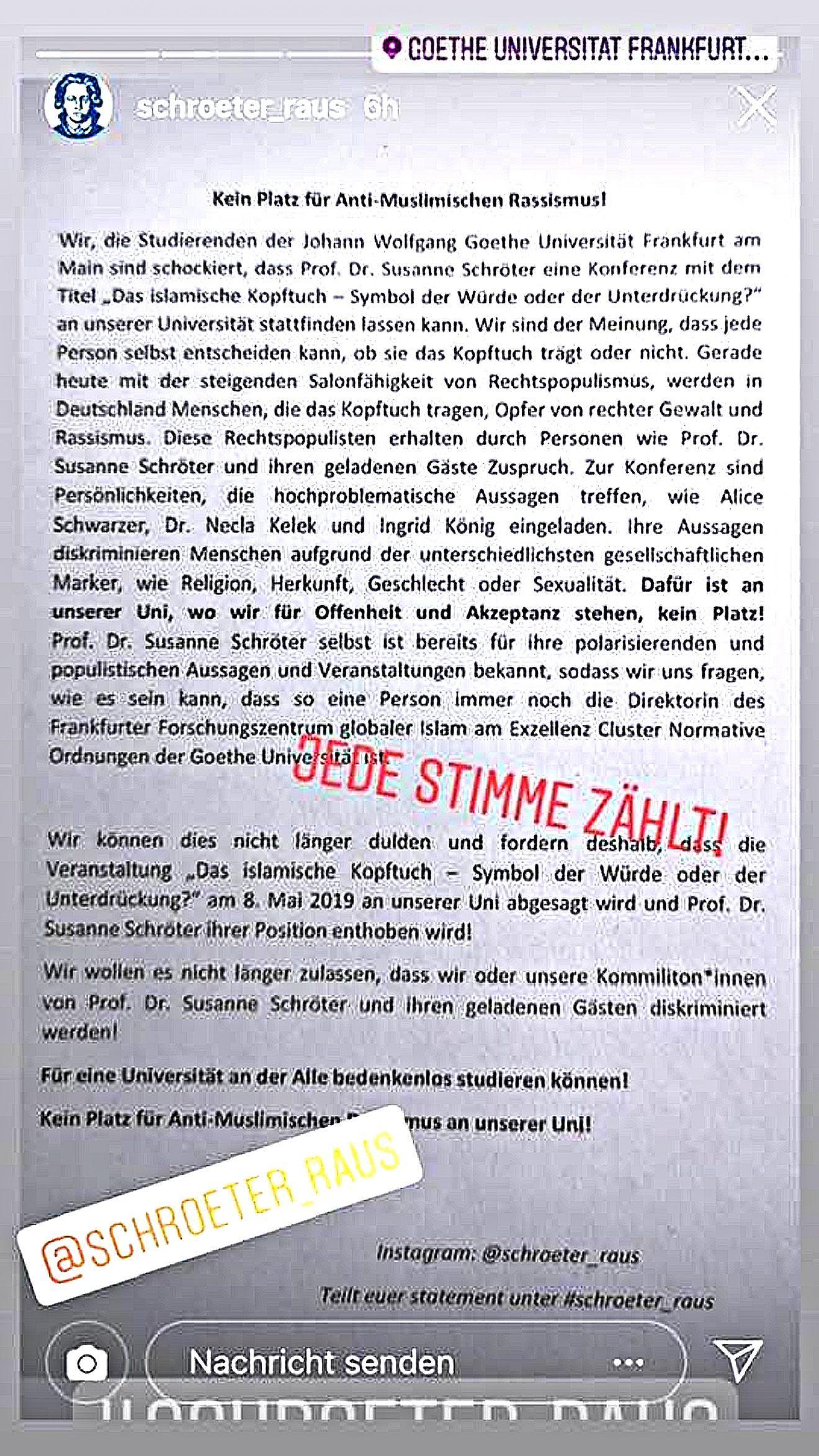 Auch in einem dritten Fall funktioniert das Markieren und moralische Vernichten einer Feindperson als Rassistin nach exakt dem gleichen Muster, nämlich dem der in Frankfurt lehrenden Ethnologin Susanne Schröter. Die Professorin und Leiterin des Forschungszentrums Globaler Islam war schon in der Vergangenheit als Kritikerin der von Ankara aus gesteuerten türkischen Religionsgemeinschaft Ditib aufgefallen und hatte ihren Funktionären Doppelzüngigkeit vorgeworfen: Lippenbekenntnisse zum deutschen Grundgesetz nach außen, eine an der Islamisierungspolitik Erdogans ausgerichtete Strategie nach innen. An der Goethe-Universität plant sie eine Konferenz zum Kopftuch als politisch-religiösem Symbol; zu der Veranstaltung lud sie pluralistisch Vertreter unterschiedlicher Ansichten zum Kopftuch ein. Aber schon die Veranstaltung allein hält eine straff organisierte Gruppe linksradikaler und muslimischer Studenten für eine Zumutung. Sie agitiert gegen die Wissenschaftlerin unter einem Hashtag, der immerhin noch nicht einmal Gesprächsbereitschaft vorgaukelt: „#Schröter raus“. Nicht nur die Konferenz soll verhindert, die Professorin soll von der Hochschule entfernt werden.