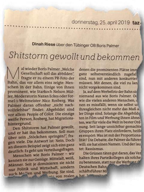 Nach dem gleichen Muster der abschließenden Urteilsverkündung meldete sich auch die grüne Parteispitze aus Robert Habeck und Annalena Baerbock zu Wort: „Boris Palmer hat eine Tür zu einem rassistischen Weltbild aufgestoßen – er sollte sie schnell wieder schließen. Er hat Menschen nach äußeren Merkmalen beurteilt und die Frage, wer zu unserer Gesellschaft gehört, daraus abgeleitet. Beides ist nicht richtig.“ Ein Grünen-Abgeordneter twitterte, Palmer sollte endlich bei den Grünen aus- und bei der AfD eintreten. Andere Parteimitglieder forderten ein Ausschlussverfahren gegen den Tübinger Oberbürgermeister. Die taz widmete einer der in der Bahn-Kampagne abgebildeten Frauen, nämlich der bei RTL moderierenden Nazan Eckes, eine Kolumne, und behauptete, sie sei „von Boris Palmer angegriffen“ worden. Eine taz-Kommentatorin schrieb: „Menschen wie Boris Palmer – wir kennen sie zur Genüge. Mittelalt, weiß, Männer.“