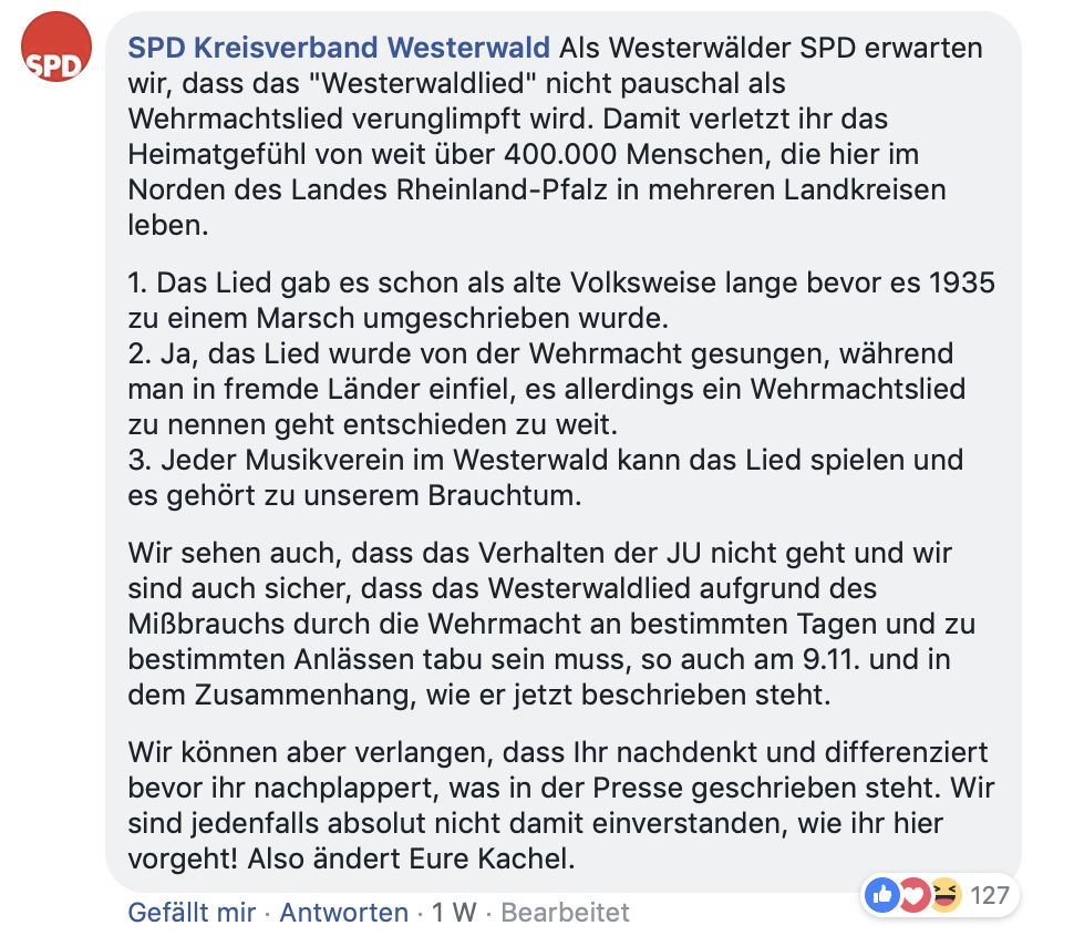 Die Antwort der Westerwälder Genossen unter dem Posting lautete: „Als Westerwälder SPD erwarten wir, dass das ‚Westerwaldlied‘ nicht pauschal als Wehrmachtslied verunglimpft wird. Damit verletzt ihr das Heimatgefühl von weit über 400.000 Menschen[.] […] Wir können […] verlangen, dass Ihr nachdenkt und differenziert bevor ihr nachplappert, was in der Presse geschrieben steht.“