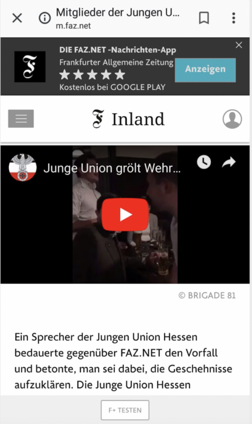 Die FAZ verlinkte in ihrem Artikel auf einen YouTube-Kanal von „BRIGADE 81“. Und so schacherte die FAZ zwar der Konkurrenz vom Berliner Tagesspiegel keine weiteren Klicks zu, verschaffte dafür aber einem rechtsextremen Kanal (inklusive schwarz-weiß-rote Flagge und Reichsadler im Logo) tausende Aufrufe. Die FAZ nahm auf diese Weise billigend in Kauf, dass junge Leute, die ich teilweise schon Jahre kenne und schätze, als Rechtsextremisten gebrandmarkt werden. Mittlerweile hat die FAZ ihren Fehler eingesehen und die Verlinkung aus dem Artikel genommen.