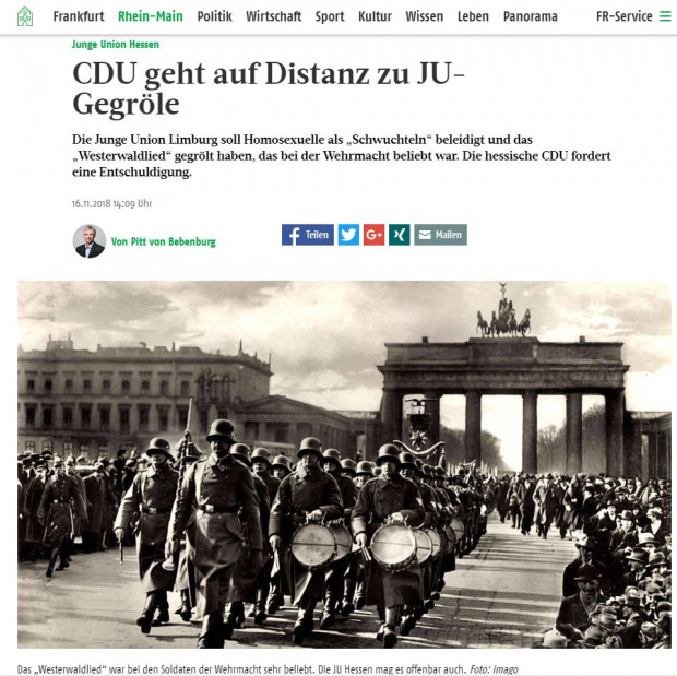 Die Frankfurter Rundschau ließ sich auch nicht lumpen. Von „JU-Gegröle“ ist die Rede. Die eher linke Tageszeitung labt sich an den Distanzierungen einiger CDU-Politiker. Das kann man der politischen Konkurrenz nicht wirklich vorwerfen. Verwerflich ist allerdings, ein Foto von einem Wehrmachtsaufmarsch durch das Brandenburger Tor als Foto in den Artikel einzubetten. Bildunterschrift: „Das ‚Westerwaldlied‘ war bei den Soldaten der Wehrmacht sehr beliebt. Die JU Hessen mag es offenbar auch.“ Es fehlte gerade noch, dass die Frankfurter Rundschau die Gesichter der JU-Sänger in die Bildaufnahme einfügt hätte.