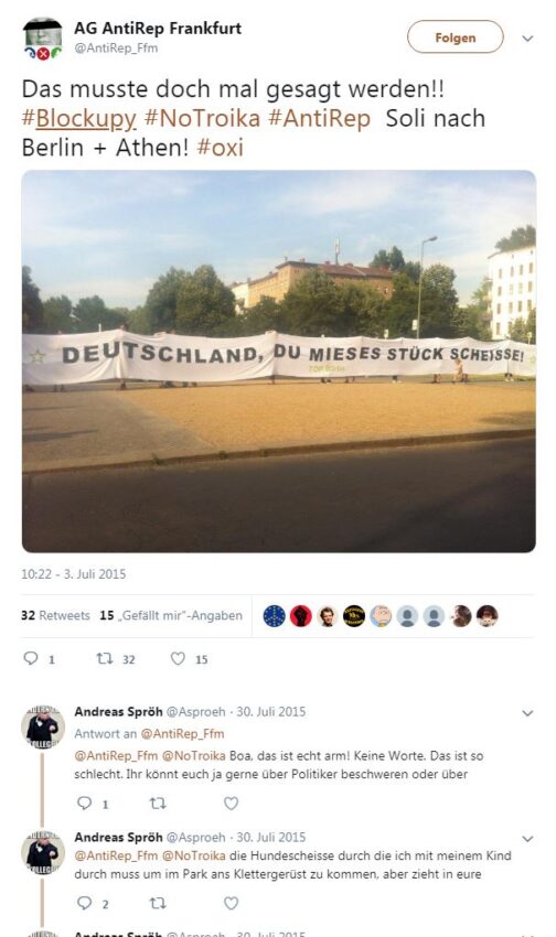 Seit der oben geschilderten Hetzjagd und der öffentlichen Verharmlosung linker Gewalt (u.a. „Jede Flasche, jeder Stein hat heute seine Berechtigung.“) schreibt er nicht mehr für die ZEIT. Alexander Fröhlich hat sich von seinem Kollegen nie distanziert. Wenn ich ihm Unrecht tue, bitte ich um Beleg und Verzeihung. Auch Robert Kiesel hegt Sympathien zur linksextremistischen Szene. So versah Kiesel auf Twitter ein Foto mit dem Inhalt „DEUTSCHLAND, DU MIESES STÜCK SCHEISSE!“ mit einem „Gefällt mir“. Seine Sympathien zur „AG AntiRep Frankfurt“ drückte er sogar mit seinem offiziellen Tagesspiegel-Profil aus. Konsequenzen? Bislang keine!