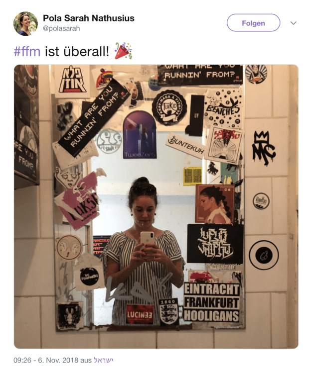 Bei der Durchsicht ihres Twitter-Accounts ist mir ein Beitrag vom 6. November ins Auge gefallen. Nathusius hat sich selbst in einem mit Aufklebern übersäten Spiegel fotografiert und das alles mit dem Kommentar „#ffm ist überall!“ versehen. „ffm“ steht für Frankfurt am Main. Die Journalistin hat sich offensichtlich darüber gefreut, in einer anderen Stadt einen Aufkleber mit Bezug zu ihrer Heimatstadt zu finden. Kleines Problem: „Eintracht Frankfurt Hooligans“ steht in großen Lettern auf dem Aufkleber.