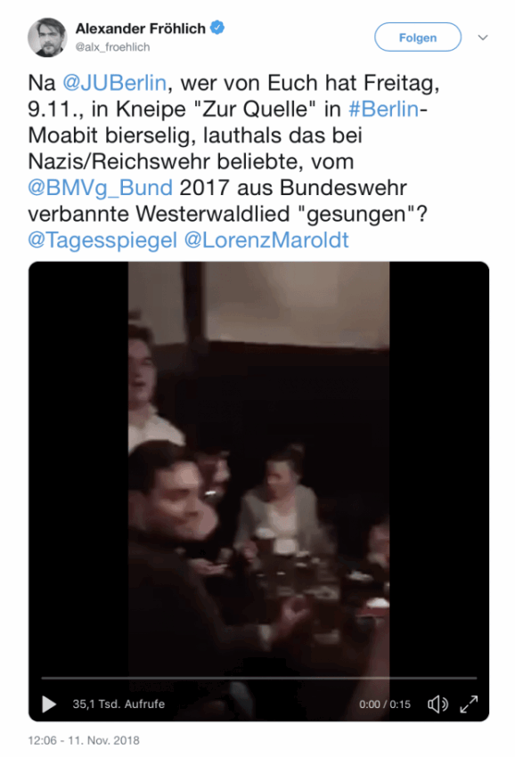 Denn am Montagmorgen startete der Berliner Tagesspiegel aus dem Dieter von Holtzbrinck-Konzern (DIE ZEIT, Handelsblatt) eine Kampagne gegen die Gruppe. Auf seinem privaten Twitter-Profil veröffentlichte Tagesspiegel- Mitarbeiter Alexander Fröhlich ein Video von besagtem Abend. In dem 15 Sekunden langen Mitschnitt sieht man, wie ein paar junge Leute das Westerwaldlied singen.