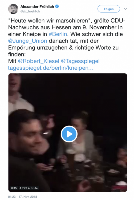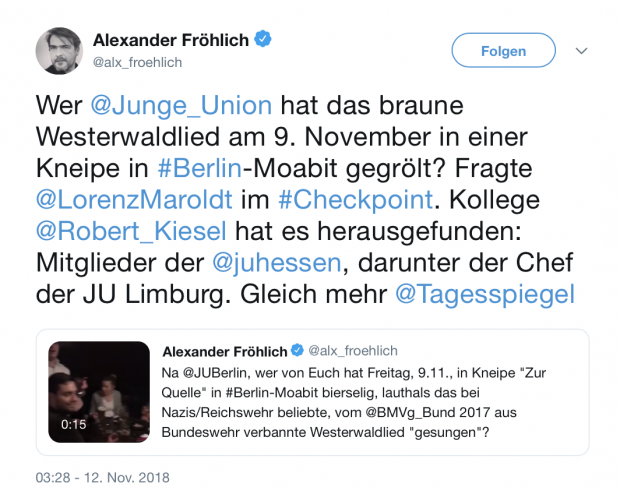 Wenig später lieferte sein Kollege Robert Kiesel die Antwort: „Mitglieder der JU Hessen, darunter der Chef der JU Limburg.“ Zu diesem Zeitpunkt wurde das Westerwaldlied von Fröhlich bereits mit dem Zusatz „braun“ versehen. Von Kiesel stammt der Tagesspiegel-Artikel „Empörung nach Wehrmachts-Eklat der Jungen Union“.