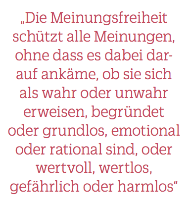 Dieses elementare Freiheitsversprechen des Grundgesetzes soll jetzt angetastet werden. Es ist die Freiheit, andere Meinungen zu äußern, aus dem Mainstream auszubrechen. Dabei ist gleichgültig, welcher Technik man sich bedient – es gibt keine geringere Freiheit für das Netz, es gibt immer nur eine Freiheit. Das Bundesverfassungsgericht urteilte in seinem Beschluss vom 28. November 2011 klar zugunsten ausgerechnet von NPD-Flugblättern: Die Meinungsfreiheit schützt alle Meinungen, „ohne dass es dabei darauf ankäme, ob sie sich als wahr oder unwahr erweisen, ob sie begründet oder grundlos, emotional oder rational sind, oder ob sie als wertvoll oder wertlos, gefährlich oder harmlos eingeschätzt werden“. Nicht einmal ihre Verfassungsmäßigkeit zählt.