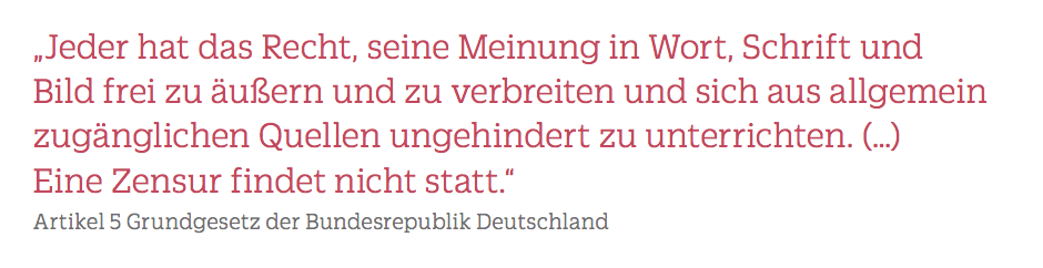 Dabei haben die Väter des Grundgesetzes so schnörkellos wie unumstößlich formuliert: „Jeder hat das Recht, seine Meinung in Wort, Schrift und Bild frei zu äußern und zu verbreiten und sich aus allgemein zugänglichen Quellen ungehindert zu unterrichten. (…) Eine Zensur findet nicht statt.“
