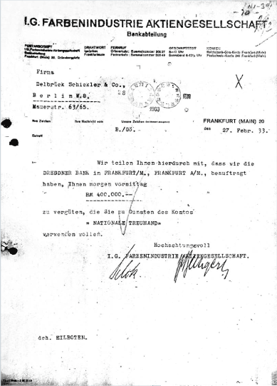 “ Diese Seite dokumentiert nur eine von zehntausenden Aufzeichnungen aus dem Nürnberger Pharma-Tribunal. Es handelt sich hier um die Kopie eines authentischen Briefs, der von der Finanzabteilung der IG Farben an das Bankhaus Delbrück in Berlin mit der Anweisung gesandt wurde, den Betrag von 400.000 Reichsmark an den „Nationalen Treuhandfonds“ zu überweisen.