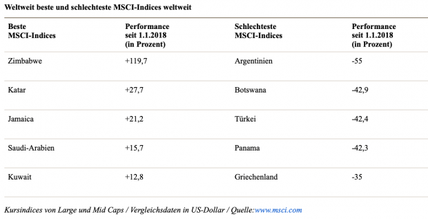 Gewiss, deutsche Anleger investieren ihr privates Vermögen vorwiegend in der Heimat. Dabei wäre ein Blick auf exotische Märkte durchaus lohnend gewesen. Aber auf Zimbabwe wäre wohl im Voraus niemand gekommen. Die Knappheit ausländischer Devisen im von politischen und wirtschaftlichen Problemen heimgesuchten Land, verbunden mit einer Anleihenkrise, haben Investoren dort in Aktien getrieben. So legte der Index beispielsweise im Oktober innerhalb weniger Tage um 55 Prozent zu. Und so schaffte es Zimbabwe dieses Jahr an die Spitze der MSCI-Länderindices mit einem Plus von fast 120 Prozent. Aber eben, das ist vor allem ein Krisensymptom. In früheren Jahren fiel diese – eher zweifelhafte – Ehre häufiger dem von Wirtschaftschaos, Hyperinflation und Währungsverfall geplagten Venezuela zu.