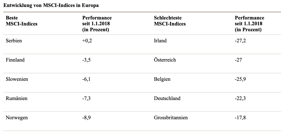Damit stehen diese Länder insgesamt besser da als die Schwellenländer. Der MCSI-Index „Schwellenländer ohne China“ hat 15,1 Prozent verloren. Neben hausgemachten Wirtschaftsproblemen leiden die vom Dollar abhängigen Schwellenländer unter der Straffung der US-Geldpolitik. Die 50 wichtigten chinesischen A-Aktien indessen gingen um 24,3 Prozent zurück. Dort schlägt klar der Handelskonflikt mit dem Rest der Welt, insbesondere den USA durch.