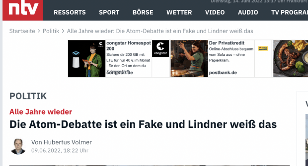 Die Plattform n-tv bezeichnete die neue Atom-Debatte in Deutschland als „Fake“, ohne auf den Stimmungsumschwung in der Bevölkerung einzugehen, und hielt Lindner vor, er habe von beim Dreikönigstreffen der FDP am 6. Januar 2022 verkündet, Atomkraft sei für Deutschland „keine Option“. Das trifft zu. Allerdings sagte Lindner das vor dem Ukraine-Krieg und der Energiepreisexplosion.