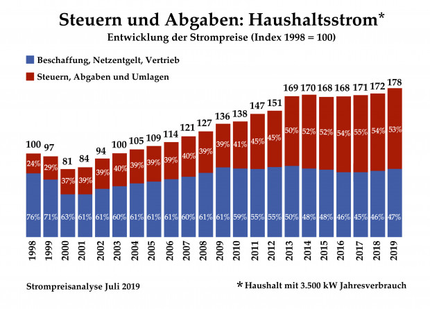 Im Jahr 2019 beträgt der Anteil von Steuern und Abgaben am Strompreis 53 Prozent. Größter Anteil darin: die Erneuerbare-Energien-Umlage von derzeit 6,405 Cent pro Kilowattstunde. Dazu kommen im Schnitt noch einmal 20 Prozent Netzgebühren. Weniger als 30 Prozent entfallen auf das eigentliche Produkt – den Strom.