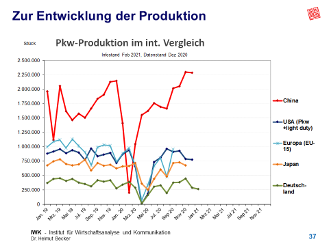 Ungeachtet der neuerlichen Lockdown im öffentlichen Leben einschließlich Händler-Verkaufsräumen hielt sich die Pkw-Produktion in allen großen Herstellerländern auf hohem Niveau. Die spiegelt die optimistischen Zukunftserwartungen der Hersteller wider.