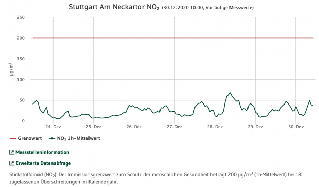 Der Jahresmittelwert für Stickstoffdioxid liege am Stuttgarter Neckartor bei 39 µg/m3 Luft. Das ist ein µg/m3 unter dem Grenzwert von 40 µg/m3. Vor vier Jahren wurden hier noch 82 µg/m3 angegeben. »Das ist ein großer Erfolg eines konsequent umgesetzten Luftreinhaltepolitik«, wird der Verkehrsminister von Baden-Württemberg, Winfried Hermann (Grüne) zitiert. Nicht mitgeteilt wurde, ob jetzt die Fahrverbote aufgehoben werden.