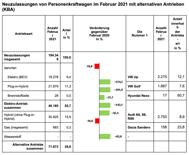 Der Aufschwung am deutschen Markt für Elektroautos hat sich auch im Februar 2021 fortgesetzt, allerdings mit deutlich weniger Dynamik als in den Monaten zuvor. Der politisch gewollte Ersatz von fossilem Treibstoff in der Benzin- und Dieselverbrennung durch Kohlestrom in Fahrzeugen mit Elektroantrieb (BEV + PHEV) macht in Deutschland deutliche Fortschritte.