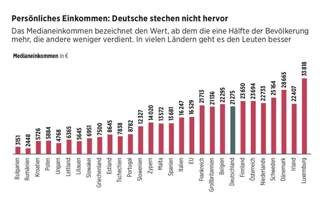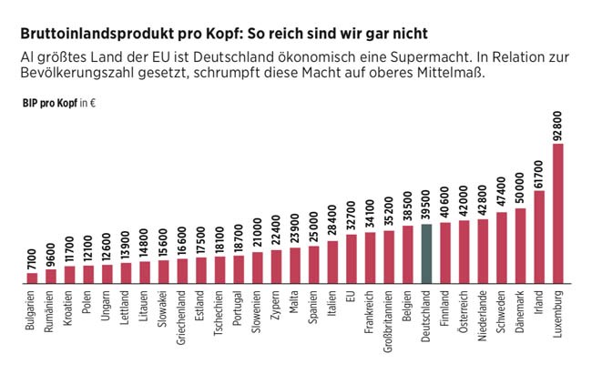 Die Geschichte vom reichen Deutschland wird gern erzählt: von Politikern, vielen Ökonomen und den meisten Medien, aber auch von unseren Partnern in der EU. Schaut man sich das Bruttoinlandsprodukt (BIP) pro Kopf im Weltvergleich an, dann zeigen Schätzdaten des Internationalen Währungsfonds (IWF) vom April dieses Jahres, dass Deutschland 2018 mit einem Pro-Kopf-BIP von 44 550 US-Dollar auf Platz 19 von 192 gelisteten Ländern liegt. Das ist durchaus stattlich. Allerdings positionieren sich im insgesamt reichen Nordeuropa immerhin zehn Länder vor Deutschland: Luxemburg, die Schweiz, Norwegen, Irland, Island, Dänemark, Schweden, die Niederlande, Österreich und Finnland.
