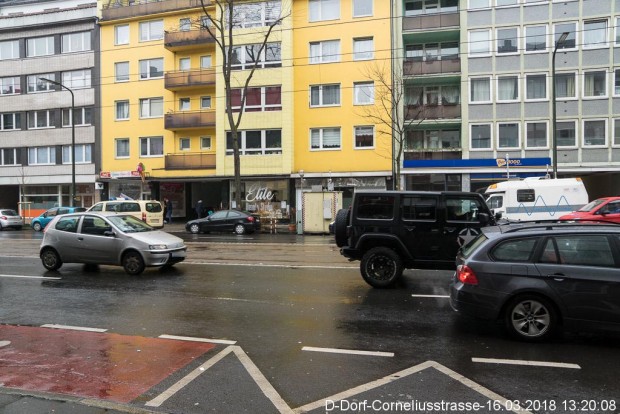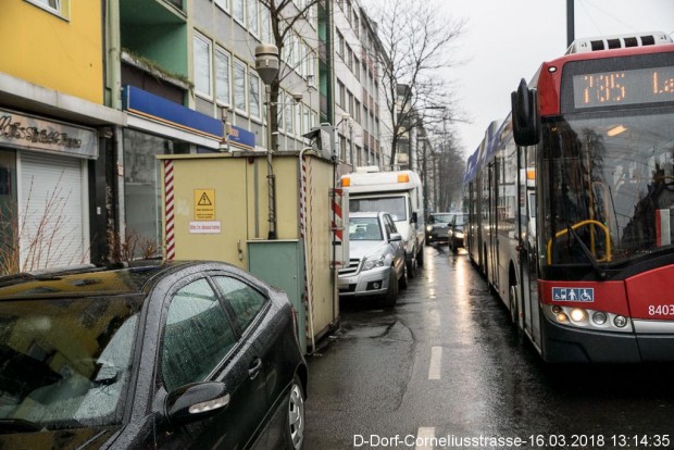 Norbert K. ist in die als stark belastet geltende Corneliusstraße in Düsseldorf gefahren und hat dort die Messanlage fotografiert. Es handelt sich um eine vierspurige Hauptverkehrsstraße mit Fahrspuren für die Straßenbahn in der Mitte und rund 17 m hohe Boden und Geschäftshäuser. Straßenschlucht sieht anders aus.