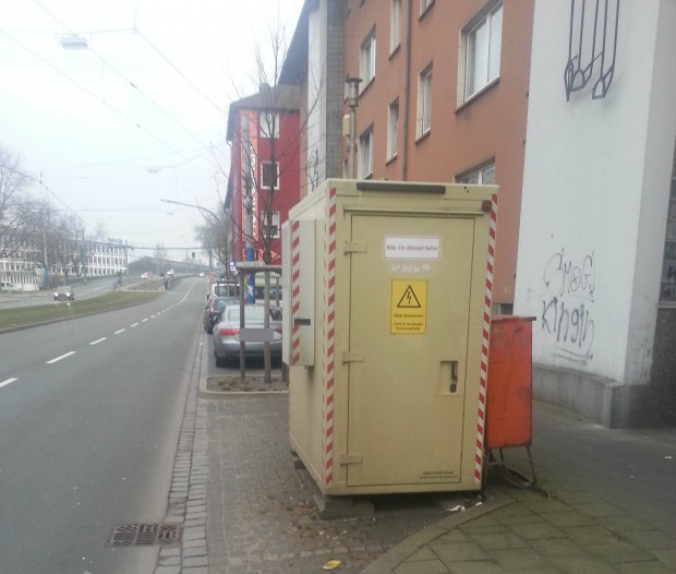 Georg I. schickt uns ein Foto der Messstation Gelsenkirchen, Kurt-Schumacher-Str. 109. »Es handelt sich hier um eine vierspurige Straße, in der Straßenmitte verlaufen Straßenbahnschienen. Das Gleisbett wurde vor ca. zwei Jahren auf einer Länge von ca. 1500 m mit Rollrasen belegt (Kosten mehrere hunderttausend Euro; Begründung: Reduzierung des Feinstaubs). Es handelt sich um eine Hauptverbindungsstraße ohne wirkliche Alternativen von Süd nach Nord. Während der Hauptverkehrszeiten gibt es durchgehend kilometerlanges Stop and go in beiden Richtungen.«