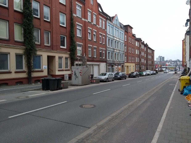 Eine Leserin aus Kiel hat die Messstation in der Bahnhofstraße in Kiel-Gaarden fotografiert. Dichter an der Straße und den Auspuffrohren geht kaum noch. Und so gibt die Tagesganglinie für NO2 den Verlauf entsprechend der Verkehrsströme zeitnah wieder.
