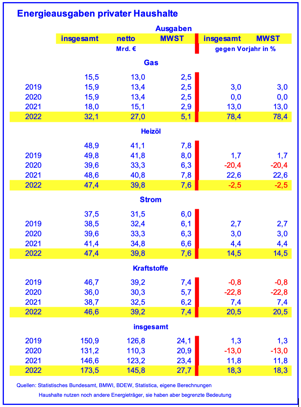 Die Energiepreise werden in Deutschland durch eine Vielzahl unterschiedlicher Steuern und Abgaben belastet, prozentual am stärksten bei Strom. Auf alles wird aber zusätzlich die Mehrwertsteuer erhoben, so steigt das Mehrwertsteuer-Aufkommen weitgehend parallel zum Preisanstieg. Steigen die Gaspreise um 100% kassiert der Finanzminister ebenfalls 100% mehr. Insgesamt stiegt das Mehrwertsteuer-Aufkommen auf Energie von 2020 bis 2022 geschätzt um rund 7 Mrd. €.