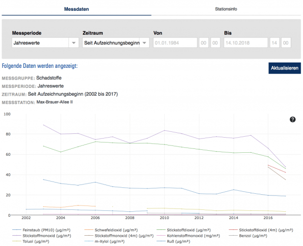 In Hamburg, der ersten Stadt mit Fahrverboten, quälen sich die Fahrzeuge jetzt über längere Umleitungsstrecken und belasten dort die Luft. Dabei zeigen die Messwerte zum Beispiel in der vom Fahrverbot betroffenen Max-Brauer-Allee seit Jahren eine deutliche Kurve nach unten. Sie liegen im Bereich von wenigen Mikrogramm über den Grenzwerten, teilweise am Rande der Messgenauigkeit der Geräte. Wobei die Messungen in Hamburg merkwürdig anmuten. Weht in der Stadt am Wasser doch fast immer ein beständiger Wind, der die Abgase eigentlich gründlich verwehen sollte.