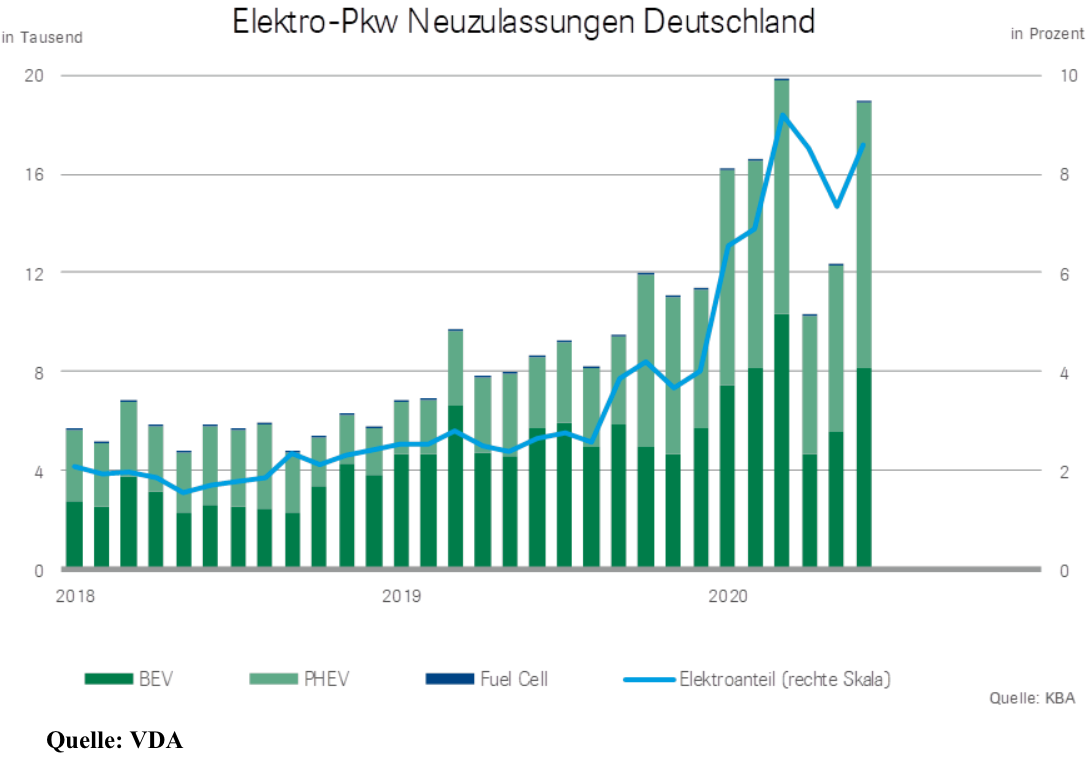 Dank der Plug-In-Hybrid-Fahrzeuge konnte die deutsche Automobilindustrie ihren Marktanteil bei Elektroautos im Juni auf 67 Prozent (Vorjahresmonat: 46 Prozent) ausbauen. Die Modelloffensive ist in vollem Gange; laut VDA bieten deutsche Konzernmarken bieten bereits jetzt rund 70 verschiedene Elektro-Modelle an. Bis Ende 2023 sollen es mehr als 150 werden.