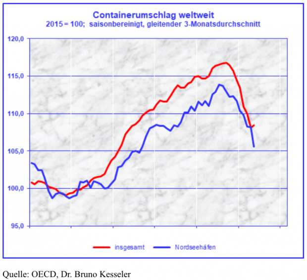 Der dramatische Einbruch der deutschen Exporte seit März setzt sich im Mai fort: Der Wert der Warenausfuhren sank im Mai gegenüber dem Vorjahresmonat massiv um 29,7 Prozent auf 80,3 Milliarden Euro. Und die Nordseehäfen wurden fast arbeitslos (Schaubild)