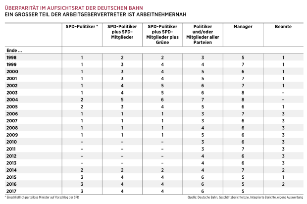 Politikerinnen im Bahnaufsichtsrat sind zurzeit die Bundestagsabgeordnete Kirsten Lühmann (SPD) und Susanne Knorre, die zwar keiner Partei angehört, aber niedersächsische Wirtschaftsministerin im SPD-Kabinett von Sigmar Gabriel war. Betrachtet man den Zeitraum von Ende 1998 bis Ende 2017, so gab es in 16 dieser 20 Jahre – ausgenommen nur die Zeit von 2010 bis 2013, als die SPD nicht an der Regierung beteiligt war – mindestens einen aktiven oder ehemaligen Politiker der SPD unter den Vertretern des Bundes im Aufsichtsrat der Deutschen Bahn.