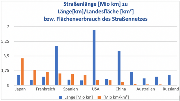 Deutschland hat nach Japan schon jetzt die zweithöchste Straßendichte der Welt, das ist die Gesamtlänge des Straßennetzes geteilt durch die Landesfläche.
