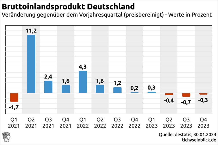 > Das Bruttoinlandsprodukt ist der grobe Maßstab unseres Wohlstands. Das ist von Ende 2022 auf Ende 2023 um 0,4 Prozent zurückgegangen.